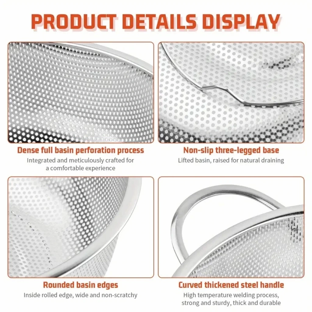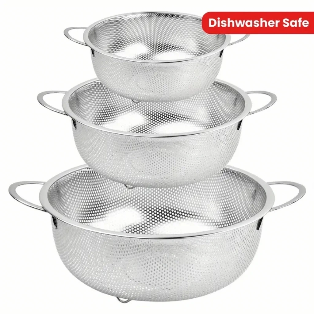 Paslanmaz Çelik Kulplu Çok Amaçlı Makarna Un Meyve Sebze 3'lü Süzgeç 25 22 19 Cm